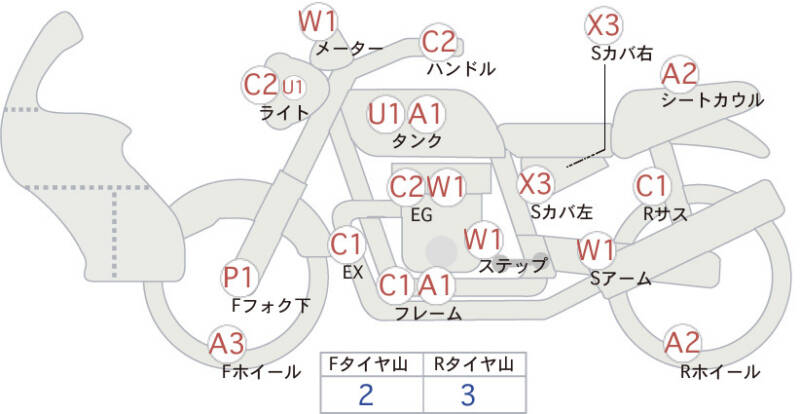 Красным маркером на схеме отмечаются места косметических повреждений.