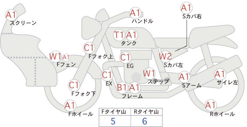 Красным маркером на схеме отмечаются места косметических повреждений.