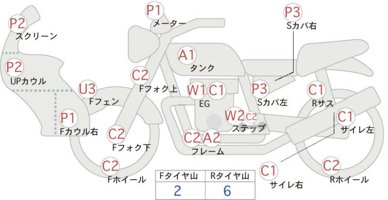 Красным маркером на схеме отмечаются места косметических повреждений.