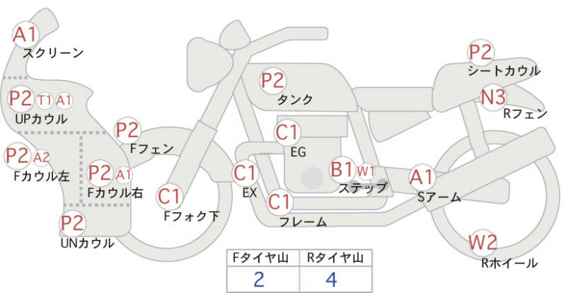 Красным маркером на схеме отмечаются места косметических повреждений.
