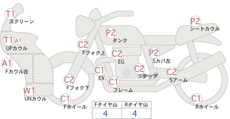 Красным маркером на схеме отмечаются места косметических повреждений.