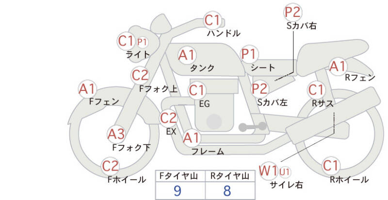 Красным маркером на схеме отмечаются места косметических повреждений.