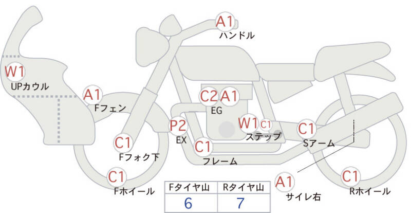 Красным маркером на схеме отмечаются места косметических повреждений.