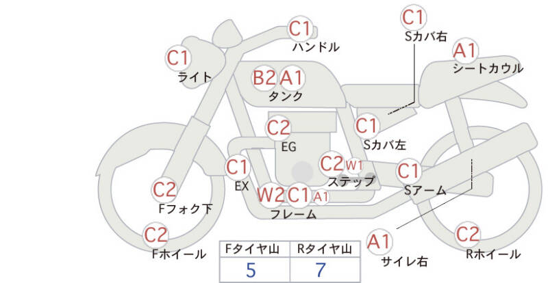 Красным маркером на схеме отмечаются места косметических повреждений.