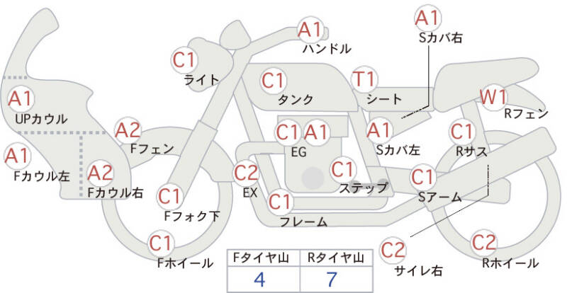 Красным маркером на схеме отмечаются места косметических повреждений.