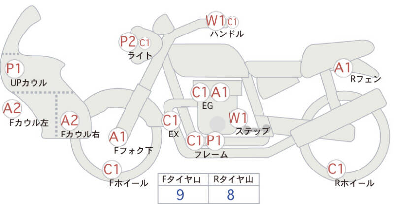 Красным маркером на схеме отмечаются места косметических повреждений.