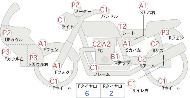 Красным маркером на схеме отмечаются места косметических повреждений.