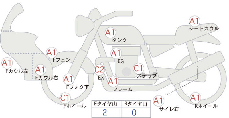 Красным маркером на схеме отмечаются места косметических повреждений.