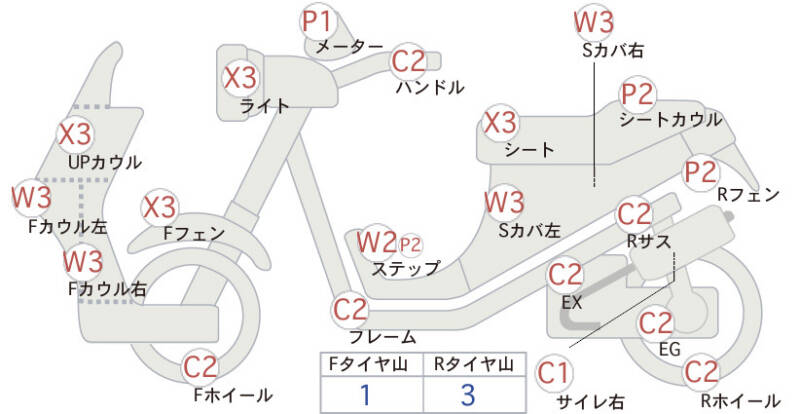 Красным маркером на схеме отмечаются места косметических повреждений.